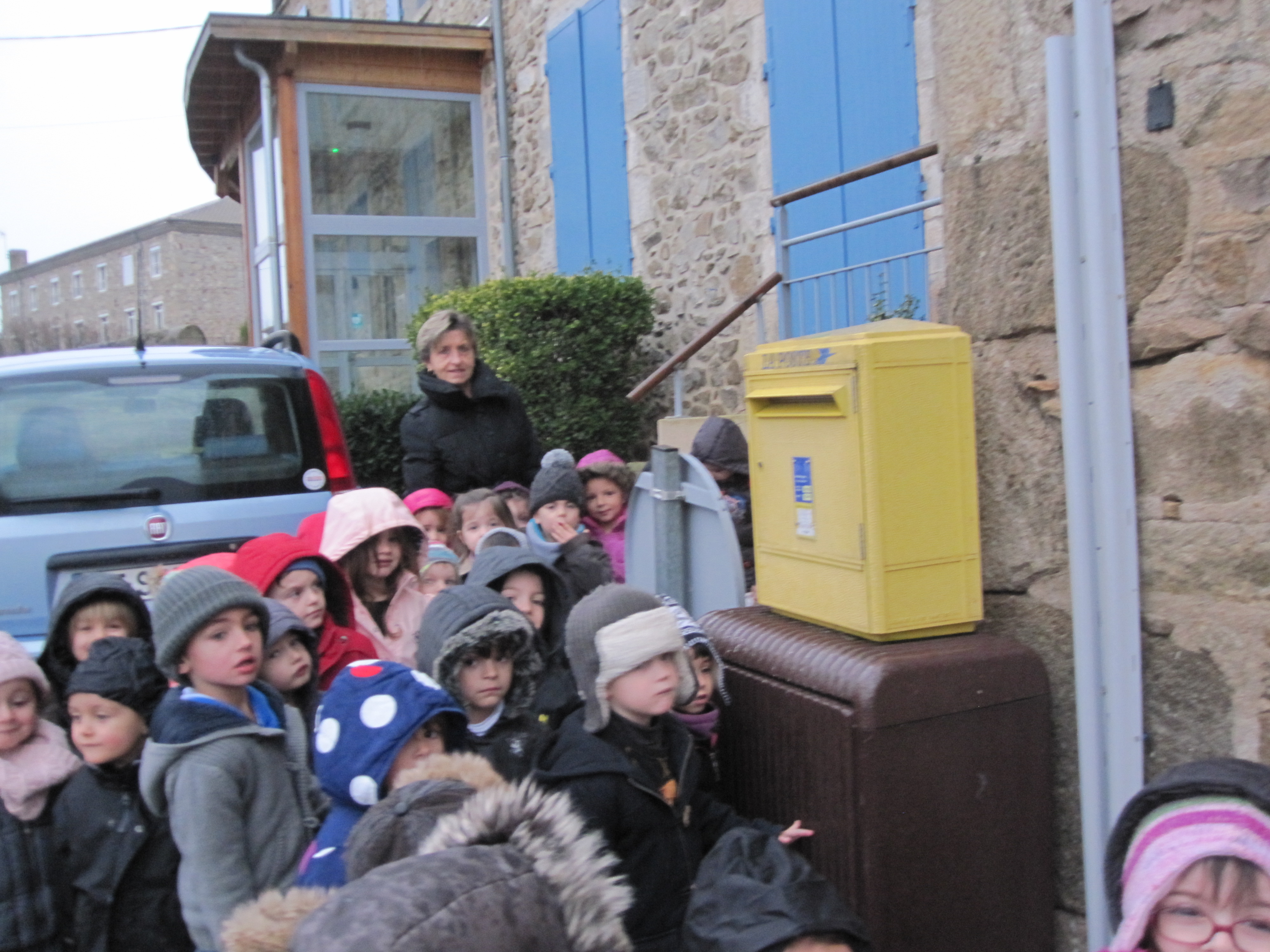 Quand tout le monde a fini sa carte, nous sommes allés les poster dans la boîte jaune de la POSTE avec Evelyne et Maîtresse Delphine.